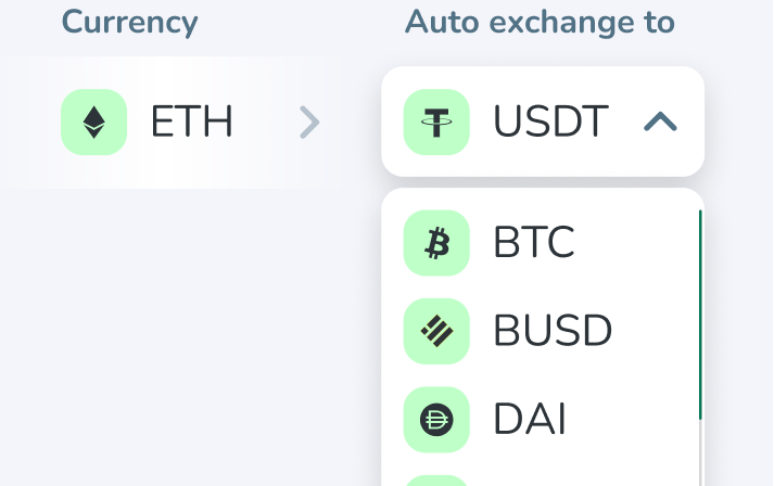 Convierte autom谩ticamente los pagos de criptomonedas entrantes en tu moneda elegida, mitigando los riesgos de volatilidad.